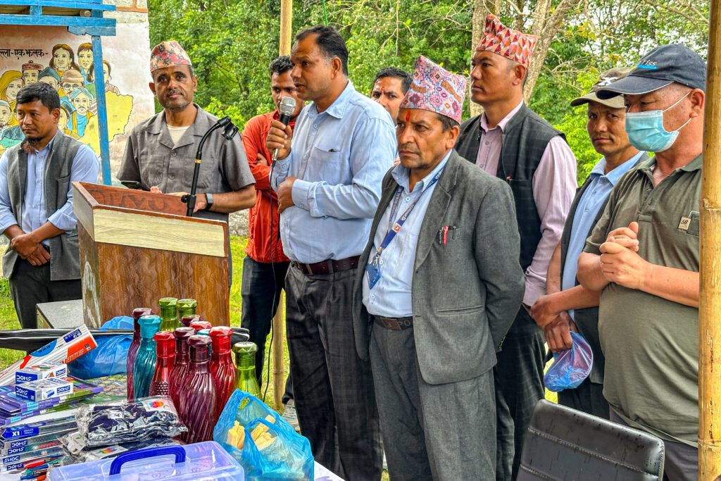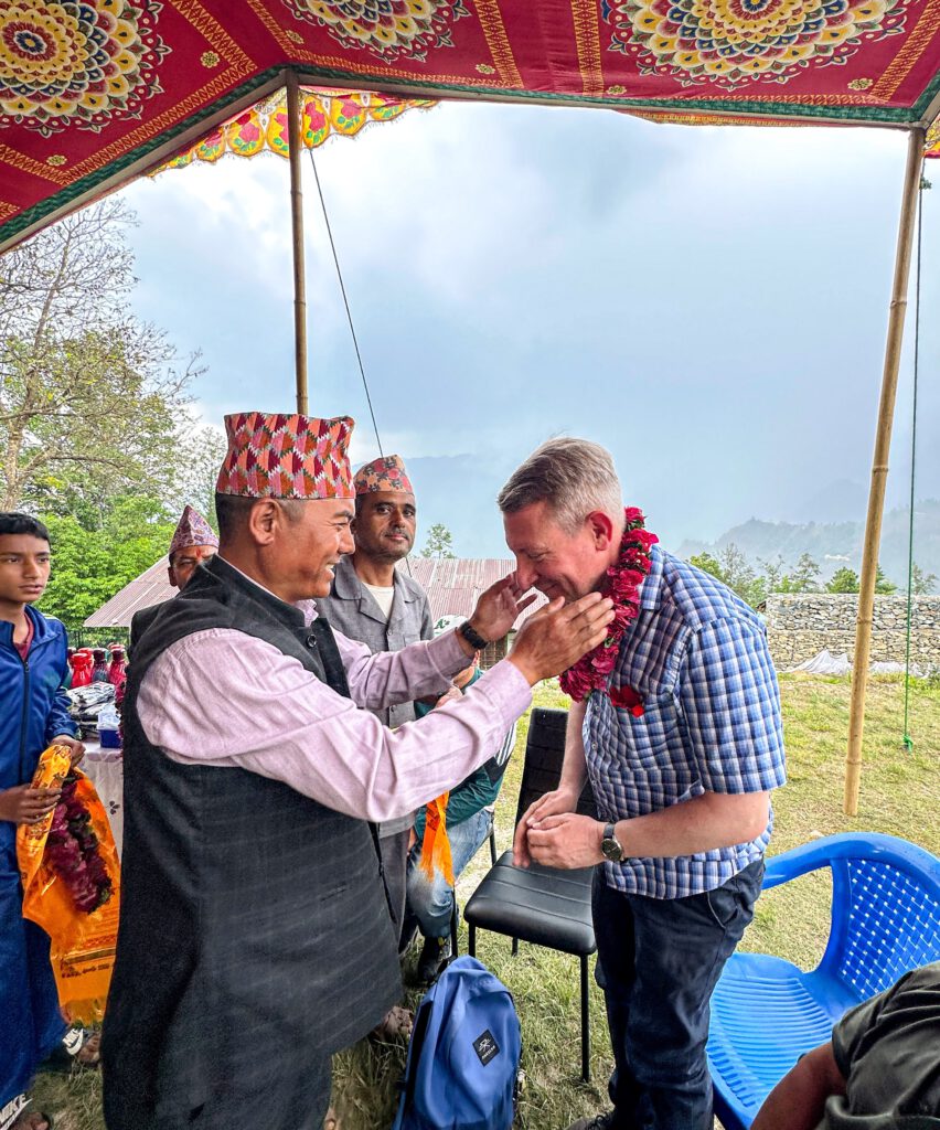 Angekommen in Dimipokhari wurden wir sehr herzlich von der Schulleitung, dem Kollegium und der Schülerschaft empfangen. Für die Spendenübergabe hatte die Schule auf dem Schulhof ein Zelt errichtet, welches auch als Regenschutz diente. Ein kleiner Regenschauer zog jedoch schnell vorbei und für den größten Teil der Zeremonie hatten wir schönes Wetter.